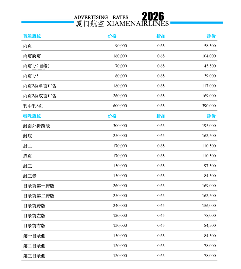 厦航航班的飞机上赠阅,背插式发行;厦门航空有限公司的机场贵宾室投放;
