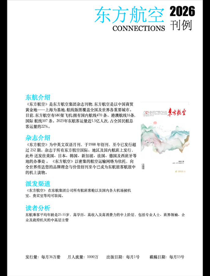 发行:每月中英文双语出版,覆盖东航全部国际及国内航线,每期触达约800万高端旅客。